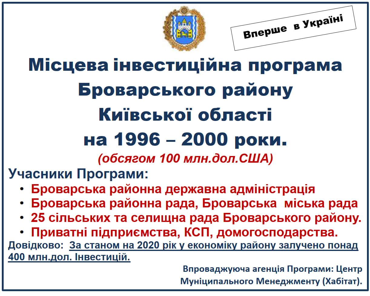 сільськими та Великодимерською селищною радою було розроблено та реалізовано Місцеву Інвестиційну Програму розвитку Броварського